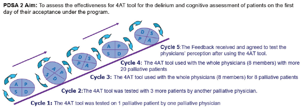 Another cycle of change was conducted using the 4AT tool for the delirium and cognitive assessment of patients on the first day of their acceptance under the program by the SPCU physicians. A palliative care physician tested the 4AT tool on a single patient. The tool was then utilized alongside the MMSE tool for 20 patients (see Figure 2).