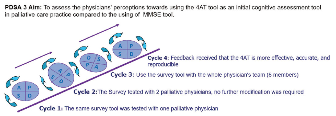 A quality improvement initiative was undertaken using the Plan-Do-Study-Act (PDSA) methodology to optimize the process of initial cognitive assessment for patients on their first day of acceptance into the palliative care program. As part of this initiative, 53 patients with advanced cancer were assessed using both the MMSE and the 4AT screening tools, with versions available in both Arabic and English. The assessments were performed on the day of admission to ensure early identification of cognitive impairment or delirium. After the implementation phase, a survey was given to palliative care doctors to gather their thoughts and experiences about how useful, easy to use, and effective the 4AT tool was compared to the MMSE.