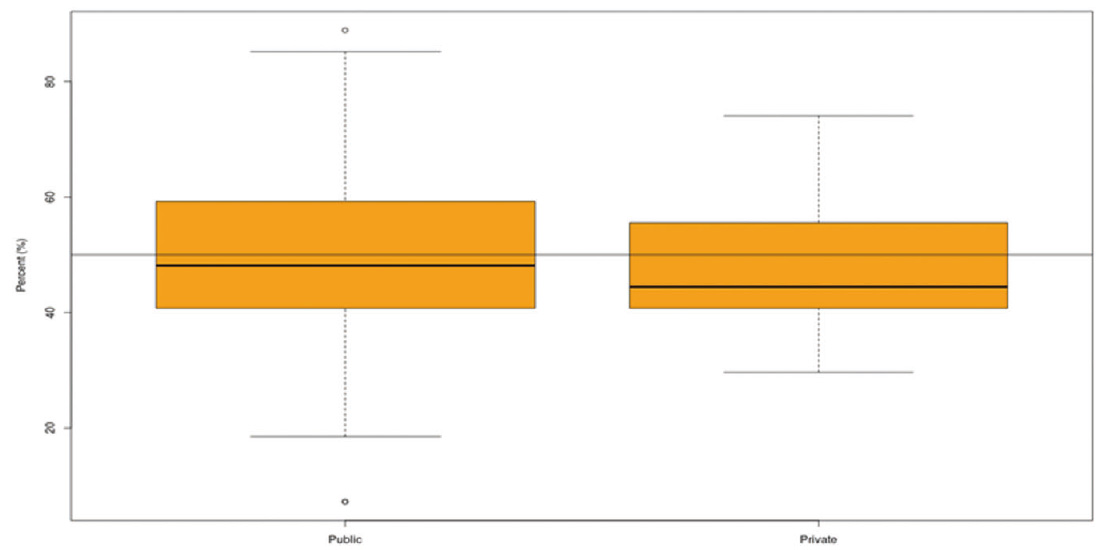 Figure 4 shows the performance of participants divided into public and private sector. The two box plots show comparable performance, with the public sector performing slightly better. This result however is not statistically significant, suggesting similar performance for both sectors.