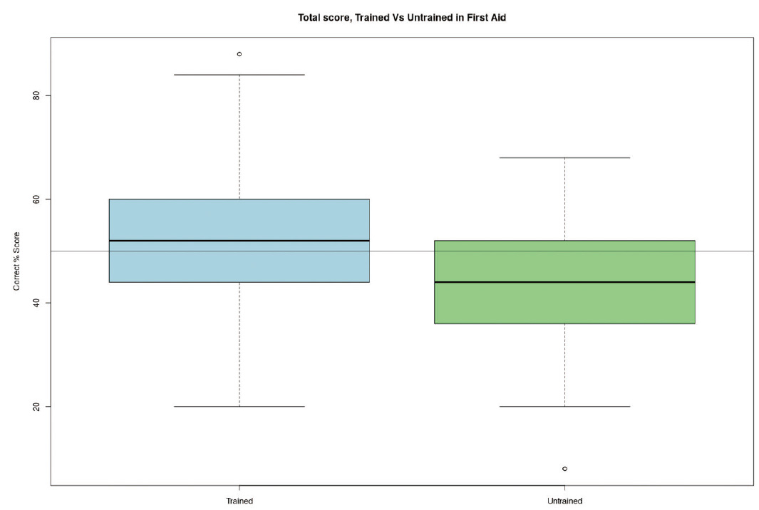 Participants who have not received such training answer at least half of the questions correctly by 43.5%, a below-baseline rate that confirms the lack of knowledge on First Aid. On the other hand, participants who have been trained answer at least half of the questions correctly by 52.7%, a percentage above the baseline that confirms knowledge competence. Therefore, the difference in performance between the two groups under study is 9.2%.