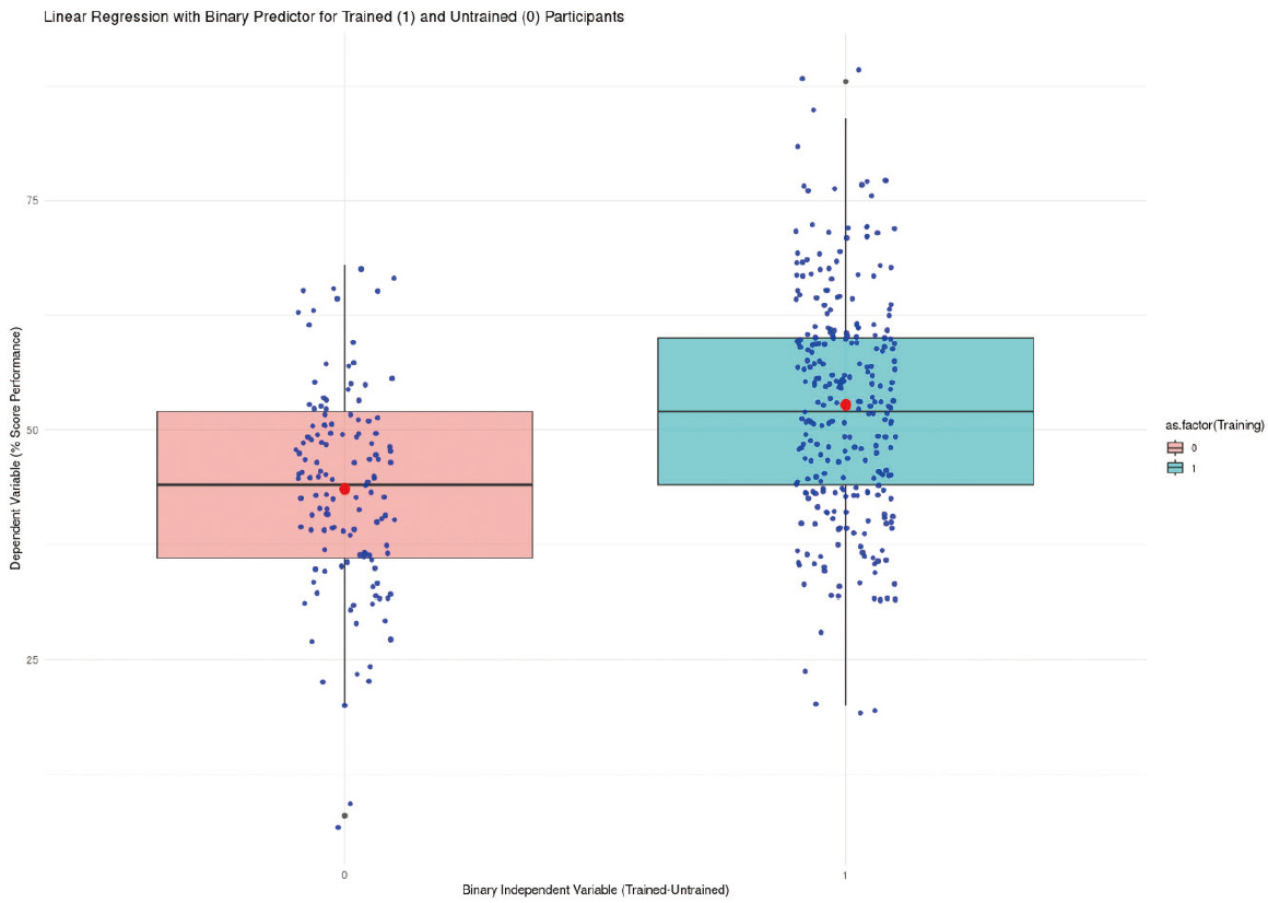 Figure 6 presents a boxplot illustrating the distribution of test scores (%) among participants with and without First Aid training. The central boxes represent the interquartile range (IQR), with the median score marked by the horizontal line within each box. The whiskers extend to 1.5 times the IQR, with individual points beyond these limits representing potential outliers. Participants who received First Aid training (coded as 1) exhibited a higher median test score compared to those without training (coded as 0). The presence of a red dot within each category indicates the mean score, reinforcing the observed trend of higher performance among trained participants. Overlaid jittered points (blue) display individual test scores, demonstrating variability within each group. The visualization supports the regression analysis, suggesting that First Aid training is associated with a statistically significant increase in test performance. The median of the data of those who have received First Aid training is higher, as is the mean score.