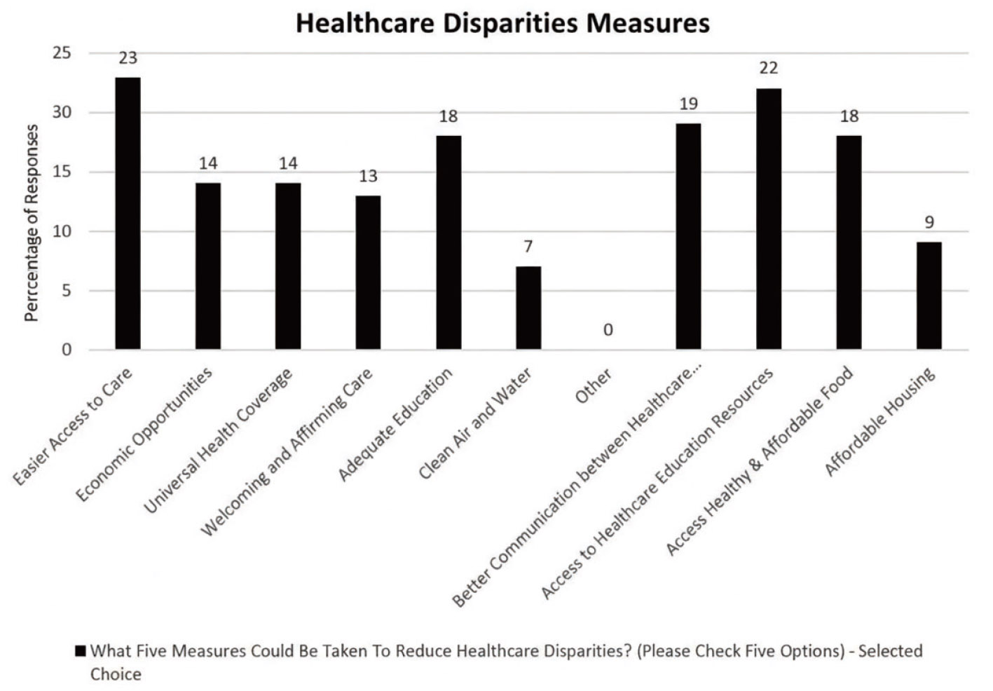 Also, 56% of respondents (18 individuals) noted adequate education as an essential measure, along with access to healthy and affordable food. Additional measures highlighted by fewer respondents included economic opportunities, 44% (14 respondents), universal health coverage 44% (14 respondents), ensuring welcoming and affirming care, 41% (13 respondents), and affordable housing, 28% (9 respondents). In the broader discussion on health disparities, 22% (7 respondents) emphasized the need for clean air and water. The findings illustrate a comprehensive approach among students to address healthcare disparities, emphasizing education, access, and communication as foundational measures for fostering health equity in their communities.
