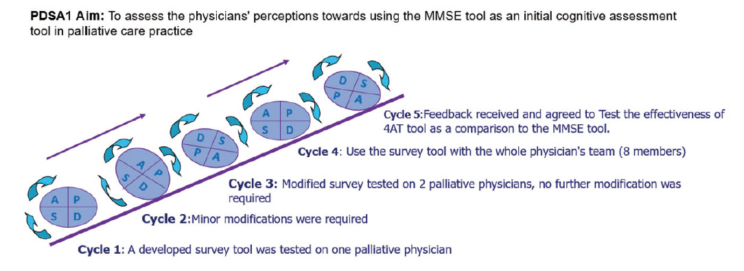 A quality improvement initiative was undertaken using the Plan-Do-Study-Act (PDSA) methodology to optimize the process of initial cognitive assessment for patients on their first day of acceptance into the palliative care program. As part of this initiative, 53 patients with advanced cancer were assessed using both the MMSE and the 4AT screening tools, with versions available in both Arabic and English. The assessments were performed on the day of admission to ensure early identification of cognitive impairment or delirium. After the implementation phase, a survey was given to palliative care doctors to gather their thoughts and experiences about how useful, easy to use, and effective the 4AT tool was compared to the MMSE.