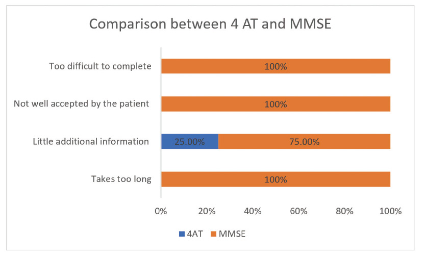The study compared the data from the pre-implementation of the MMSE tool to that after the introduction of the 4AT from 2nd quarter of 2022 to 2nd quarter of 2023. A survey conducted among eight palliative care physicians revealed that 63% found the MMSE tool to be too lengthy, 87.5% (7 out of 8) believed it provided insufficient information, 63% (5 out of 8) thought it was challenging for patients to understand, and 75% found it difficult to complete. In contrast, 100% of the physicians found the 4AT tool to be simpler and easier to complete. They reported it as 75% effective in assessing cognitive status, indicated that 62.5% found it useful, and stated that 100% believed it was better accepted by palliative care patients compared to the MMSE. The results suggest that the 4AT tool is a more appropriate option for clinical practice in palliative care (see Figure 4).