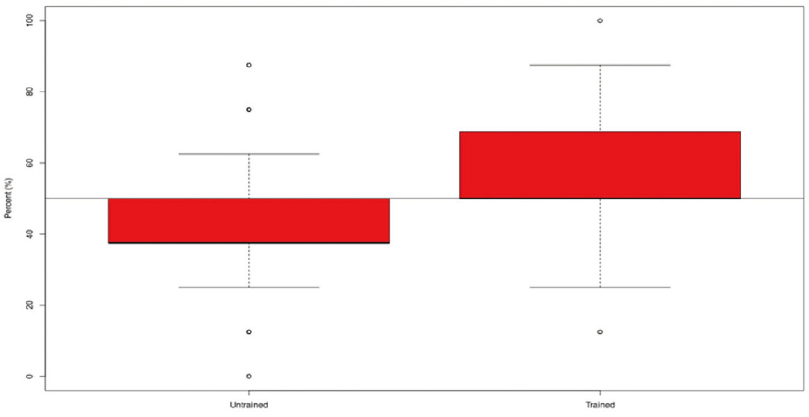 Figure 2 shows the distributions of the correct answers of trained and untrained participants in CPR. Notice that most untrained participants do not achieve the successful score (50% of correct answers), while many trained participants achieve and surpass the successful score. This difference is statistically significant.