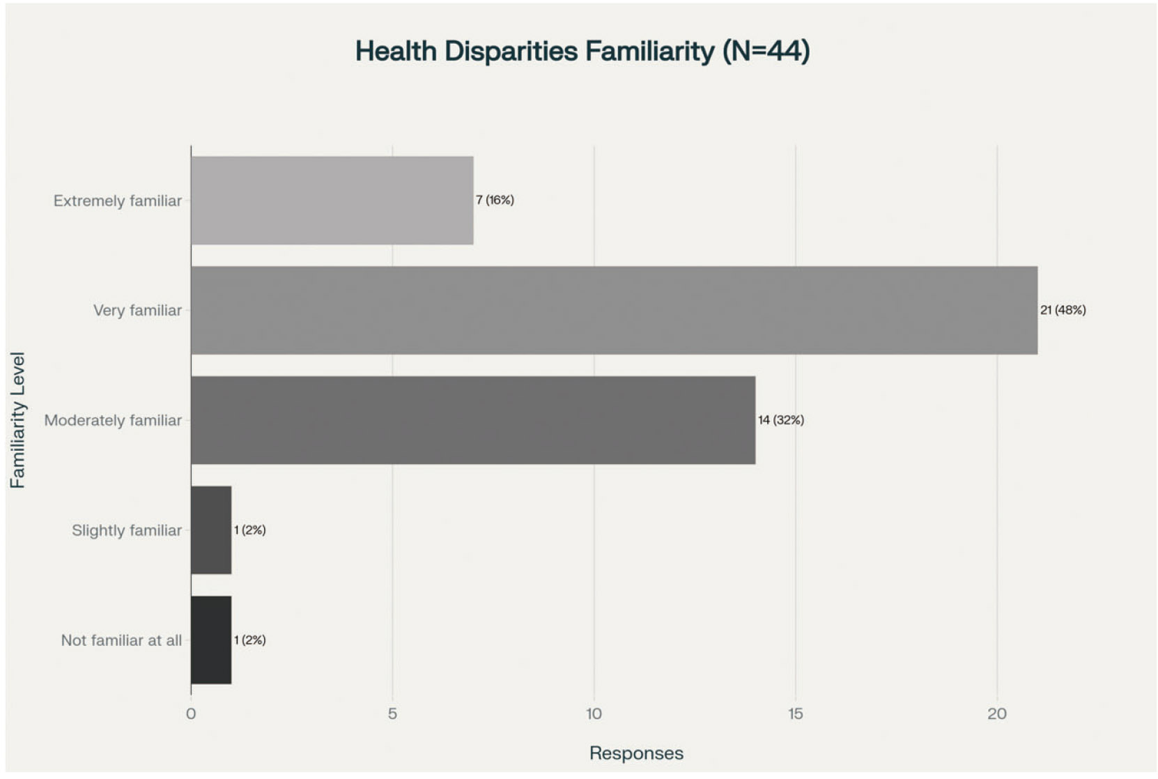 This group may benefit from further education on how health disparities affect different populations. Only a small fraction of respondents are slightly familiar (2%) or unfamiliar (2%) with health disparities. This suggests that very few respondents are entirely unaware of this issue, reflecting a general awareness. Forty-four respondents answered this question. The overwhelming majority (98%) are at least somewhat familiar with health disparities, indicating that this topic is relevant to respondents’ knowledge base through their engagement with public health or nursing education.