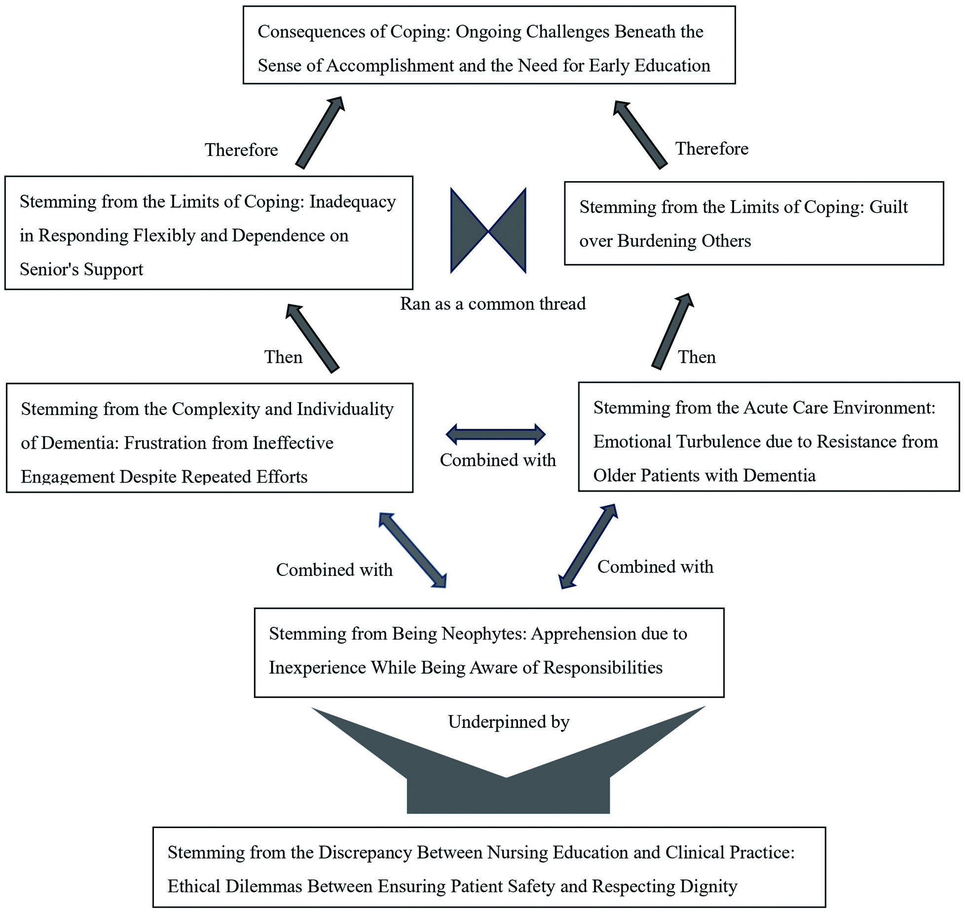 The structural framework identified in this study highlights that the difficulties experienced by novice nurses in acute dementia care are not isolated issues but are dynamically interconnected. Ethical dilemmas between patient safety and dignity underpin multiple challenges, while inexperience, the acute care environment, and the complexity of dementia interact to intensify emotional burden, guilt, and feelings of inadequacy. Importantly, the framework indicates that support needs differ across stages of the transition period and must address not only skill acquisition but also emotional and ethical challenges.